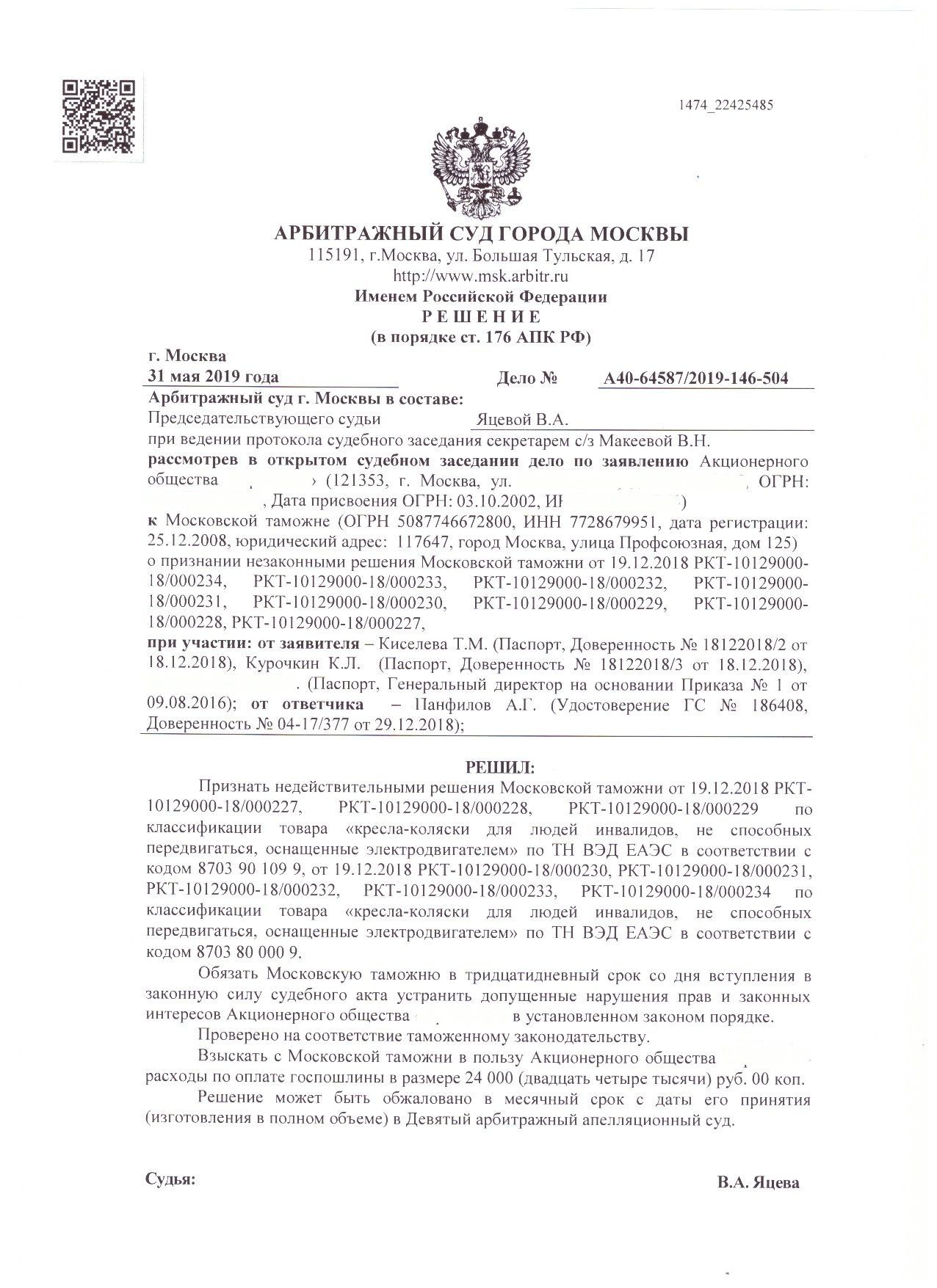 | извлечение из решения арбитражного суда города москвы от 31.05.2019 по делу № а40-64587/2019 | |